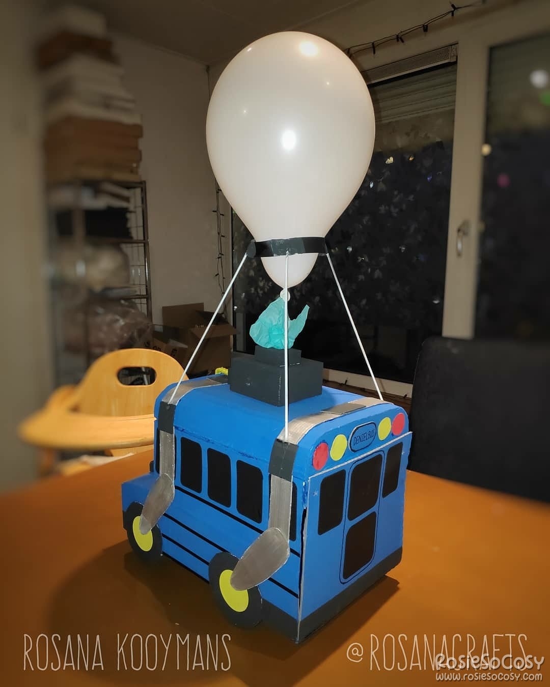 Reason I've been so busy the past few days. Been crafting a "surprise" for Sinterklaas. It's like Secret Santa, but for kids during the Sinterklaas period. For those unfamiliar with what you can see in the photos: this is a Battle Bus from Fortnite, made entirely out of cardboard, 4 skewers, a shoe lace and a balloon. Obviously we also used glue and tape. And lots of paint to decorate it. My eldest son is not as crafty as I am, so I helped him "a little" 😂 He wouldn't have been able to finish this in time without me. Besides, I figured this is probably the last time I'll have the chance to help him with this, since surprises are a thing from elementary school here. The back side opens so the person it's made for receives Fortnite gifts which is what they asked for, hence the theme of the surprise.